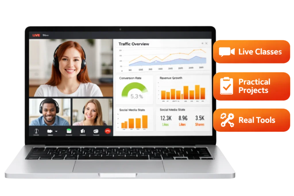 Live Classes • Practical Projects • Real Tools • Industry MentorsLearn SEO, Paid Ads, Content Marketing, AI & Automation by doing real-world work — not just watching recorded videos. Build hands-on experience, work on live campaigns, and gain job-ready skills guided by industry experts.